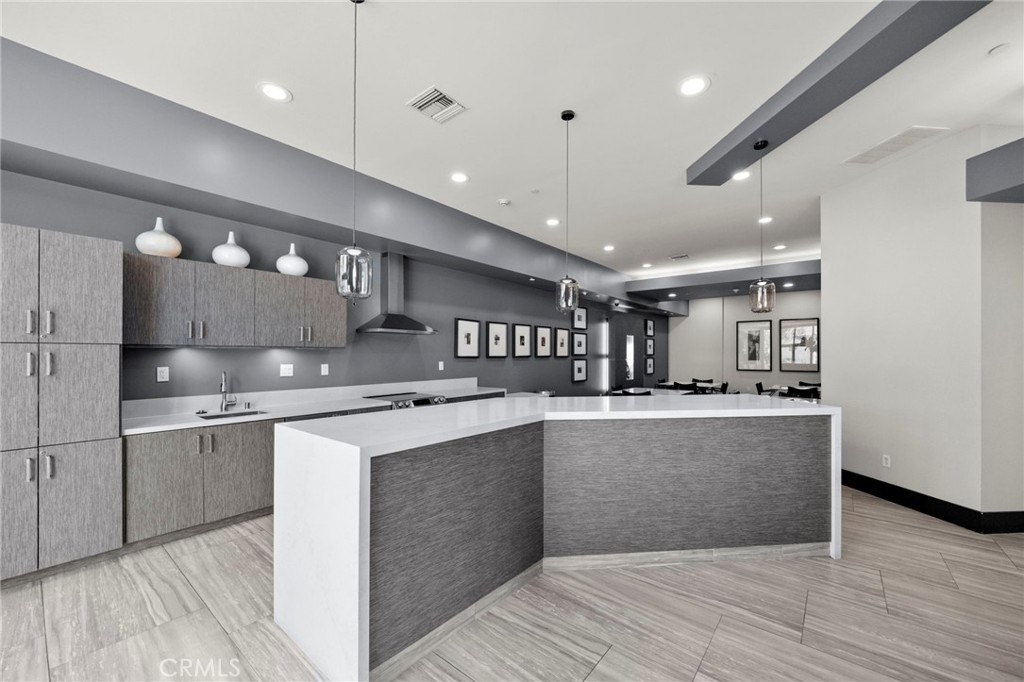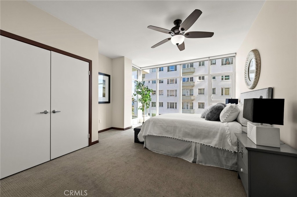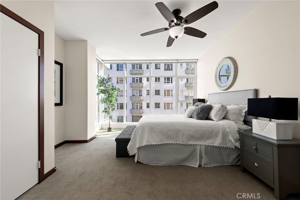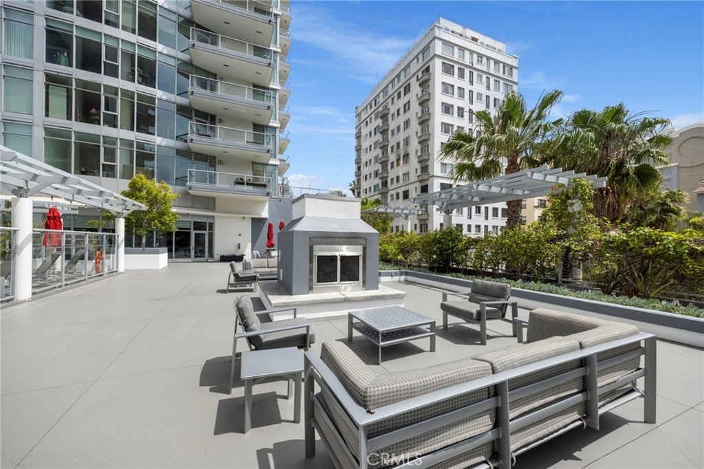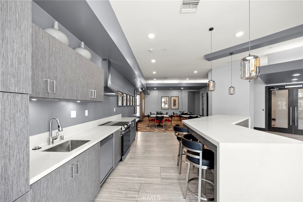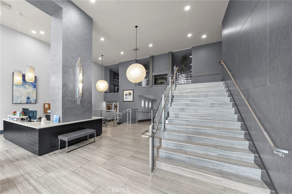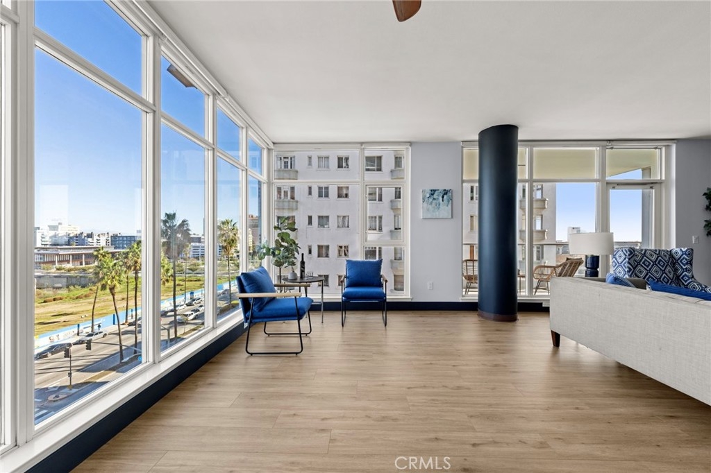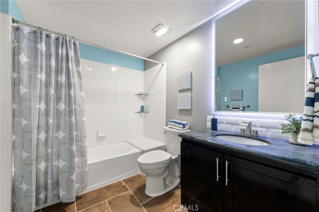 This stylish two-bedroom, two-bath residence in a sought-after downtown Long Beach high-rise blends contemporary comfort with sweeping city and harbor views. Floor-to-ceiling windows bathe the open-concept interior in natural light, accentuating the sleek plank flooring that flows throughout the home. The thoughtfully designed kitchen is ideal for both everyday living and entertaining, anchored by a generous eat-in island and finished with epoxied granite countertops for a polished, modern look. Striking two-tone cabinetry, crisp white lowers paired with bold black uppers, adds visual depth, complemented by a stylish backsplash and a dedicated dining area just beyond. The primary suite offers a tranquil retreat with dual closets and a private bath featuring dual vanities and a sophisticated glass-enclosed shower. A spacious secondary bedroom is conveniently located near a full guest bathroom, complete with a soaking tub and illuminated vanity mirror. Additional highlights include in-unit stackable washer/dryer hookups discreetly tucked into a closet and an expansive balcony, perfect for relaxing or entertaining while taking in iconic views of the Queen Mary. Residents enjoy two assigned parking spaces, guest parking, and access to an exceptional collection of building amenities, including controlled access, concierge and security services, a mail room, a catering kitchen, a resort-style pool and spa, a sauna, a fitness center, outdoor dining and BBQ areas, and an inviting outdoor fireplace. Where sophisticated design, sweeping views, and premier amenities come together in one exceptional residence.