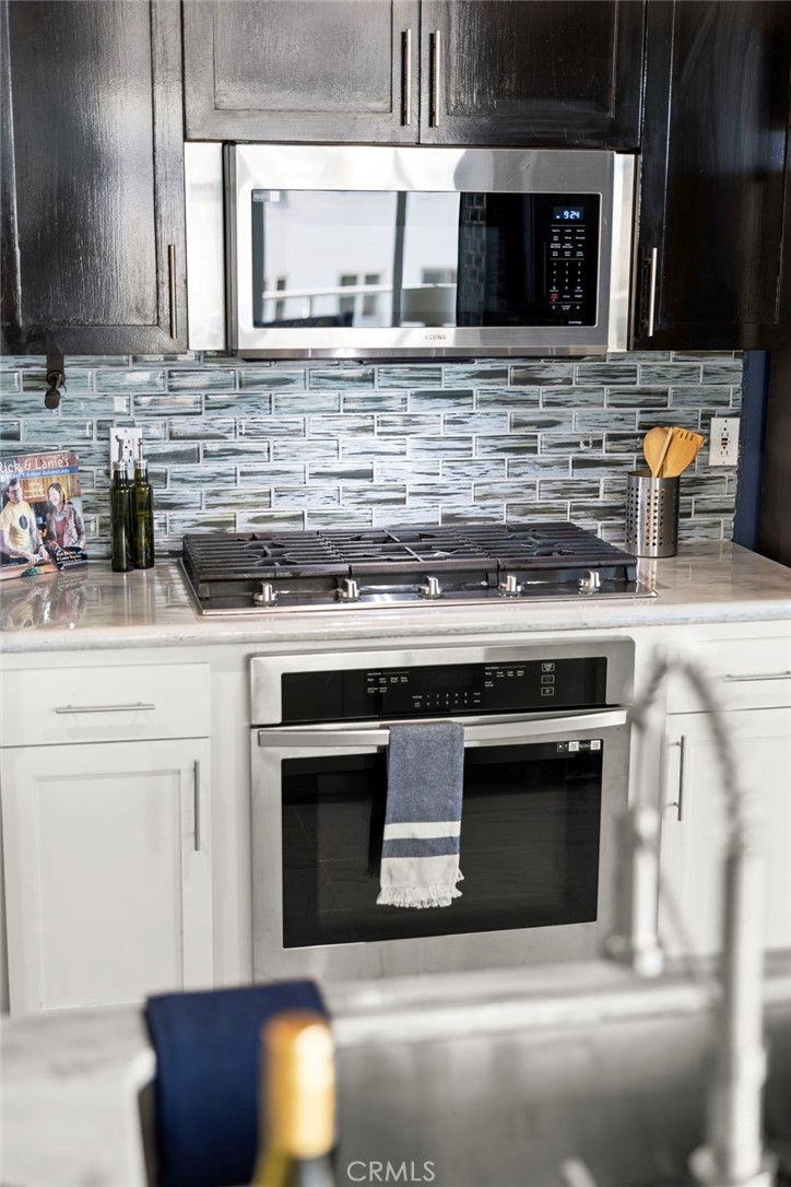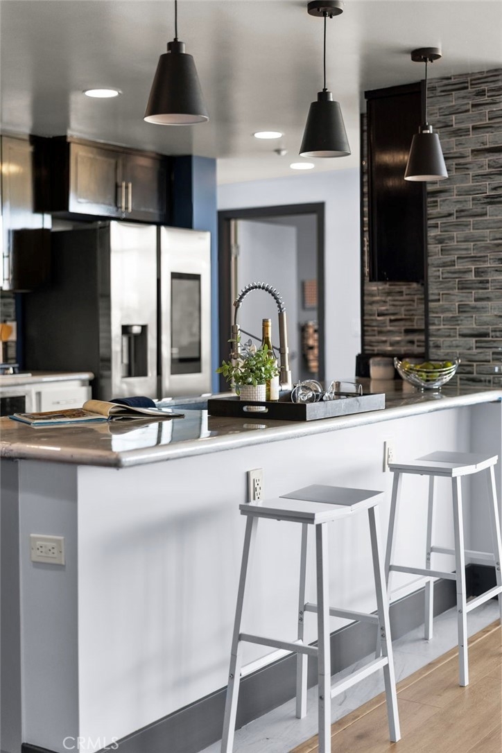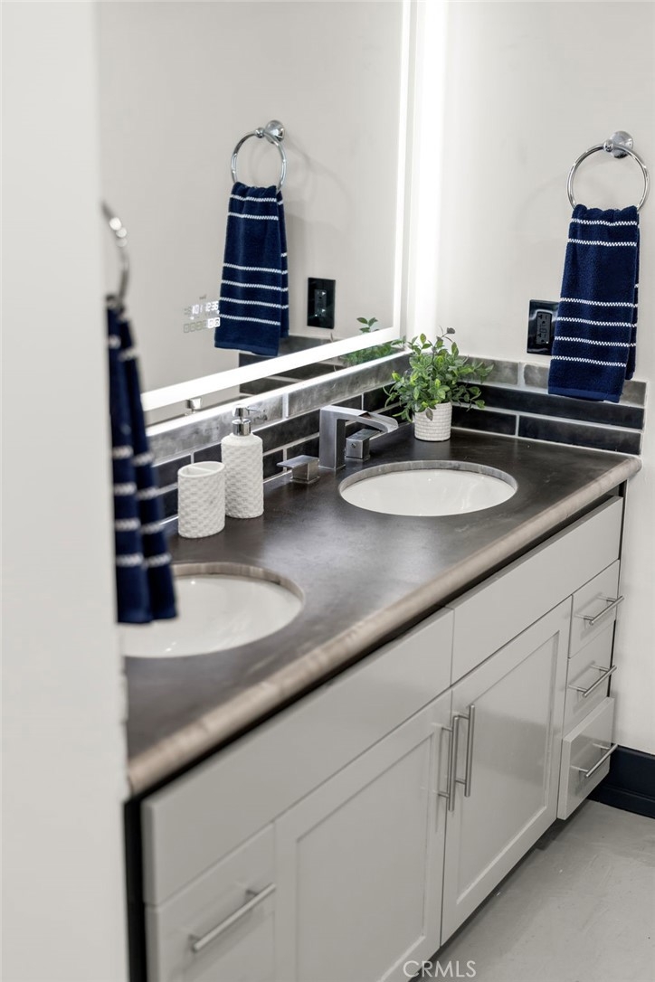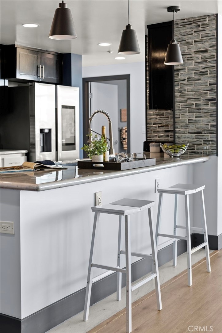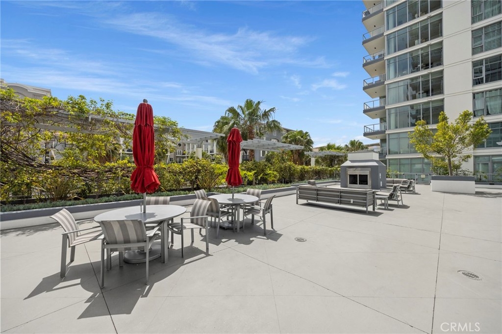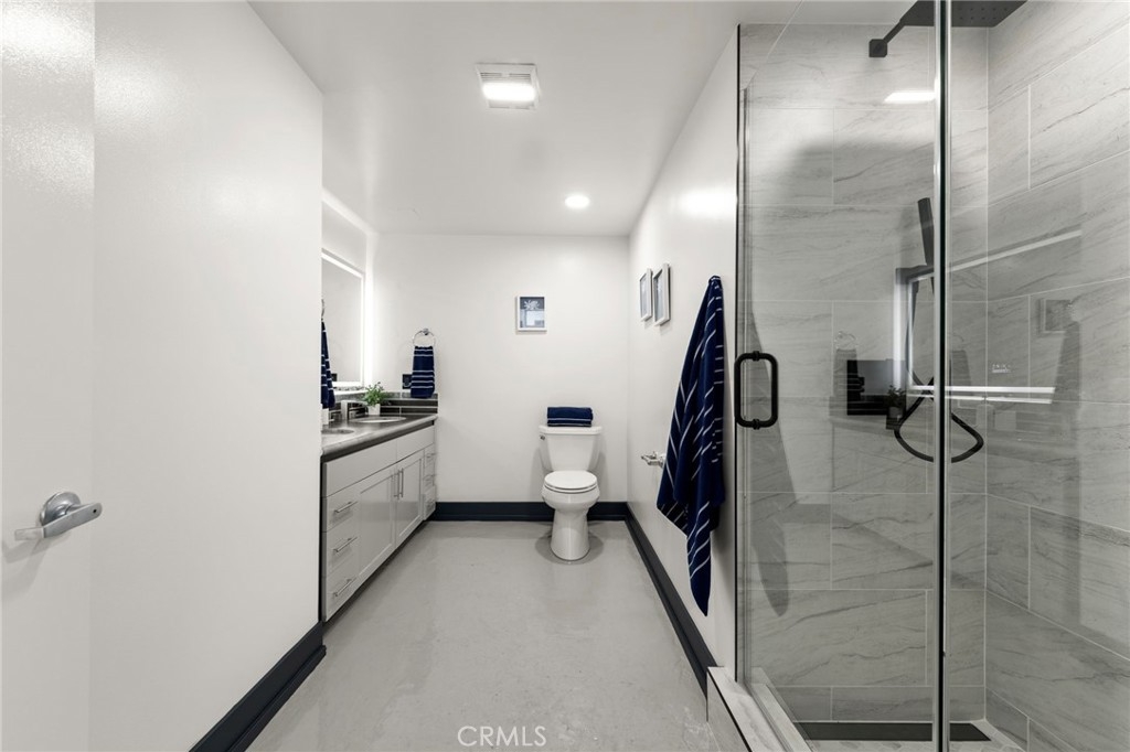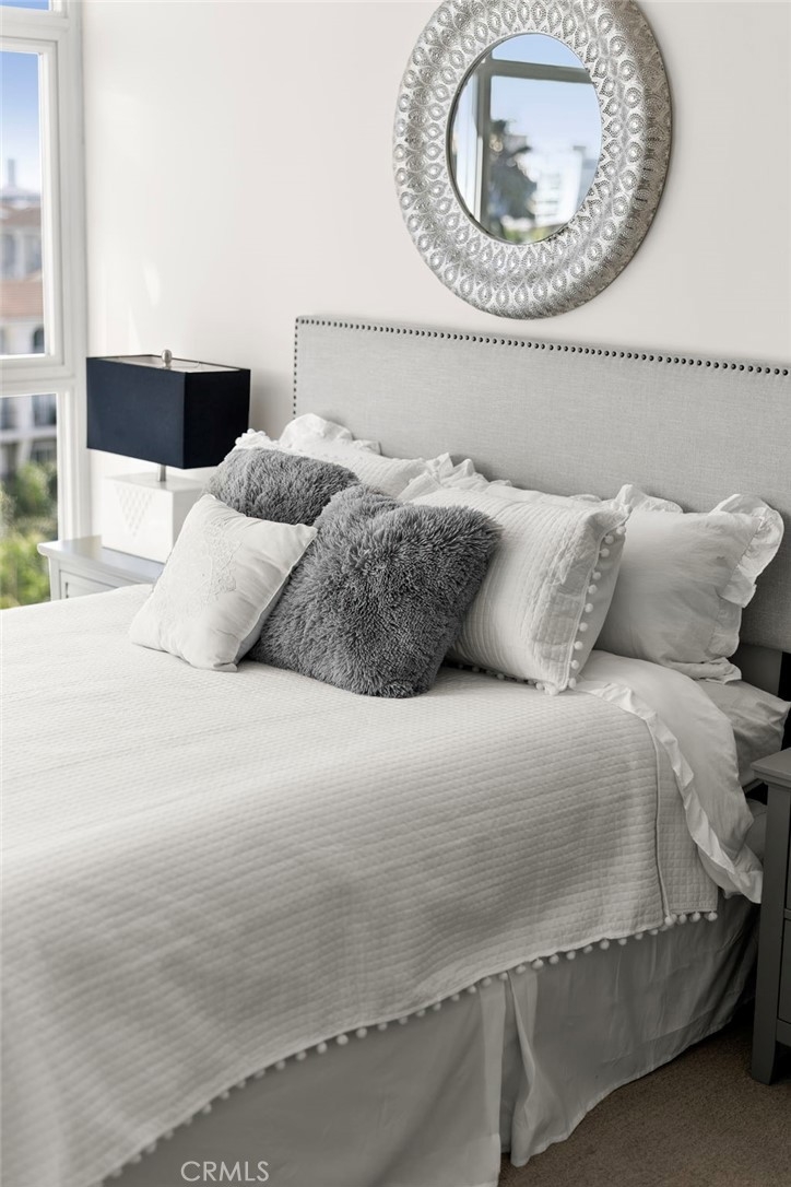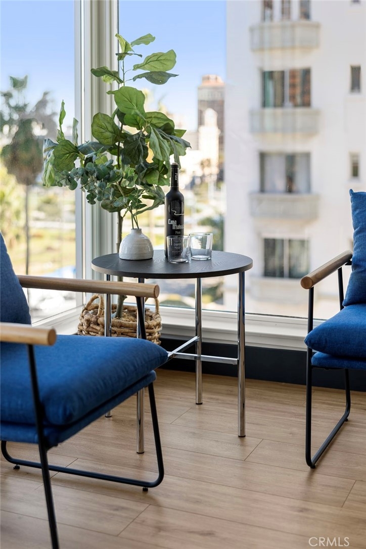 This stylish two-bedroom, two-bath residence in a sought-after downtown Long Beach high-rise blends contemporary comfort with sweeping city and harbor views. Floor-to-ceiling windows bathe the open-concept interior in natural light, accentuating the sleek plank flooring that flows throughout the home. The thoughtfully designed kitchen is ideal for both everyday living and entertaining, anchored by a generous eat-in island and finished with epoxied granite countertops for a polished, modern look. Striking two-tone cabinetry, crisp white lowers paired with bold black uppers, adds visual depth, complemented by a stylish backsplash and a dedicated dining area just beyond. The primary suite offers a tranquil retreat with dual closets and a private bath featuring dual vanities and a sophisticated glass-enclosed shower. A spacious secondary bedroom is conveniently located near a full guest bathroom, complete with a soaking tub and illuminated vanity mirror. Additional highlights include in-unit stackable washer/dryer hookups discreetly tucked into a closet and an expansive balcony, perfect for relaxing or entertaining while taking in iconic views of the Queen Mary. Residents enjoy two assigned parking spaces, guest parking, and access to an exceptional collection of building amenities, including controlled access, concierge and security services, a mail room, a catering kitchen, a resort-style pool and spa, a sauna, a fitness center, outdoor dining and BBQ areas, and an inviting outdoor fireplace. Where sophisticated design, sweeping views, and premier amenities come together in one exceptional residence.