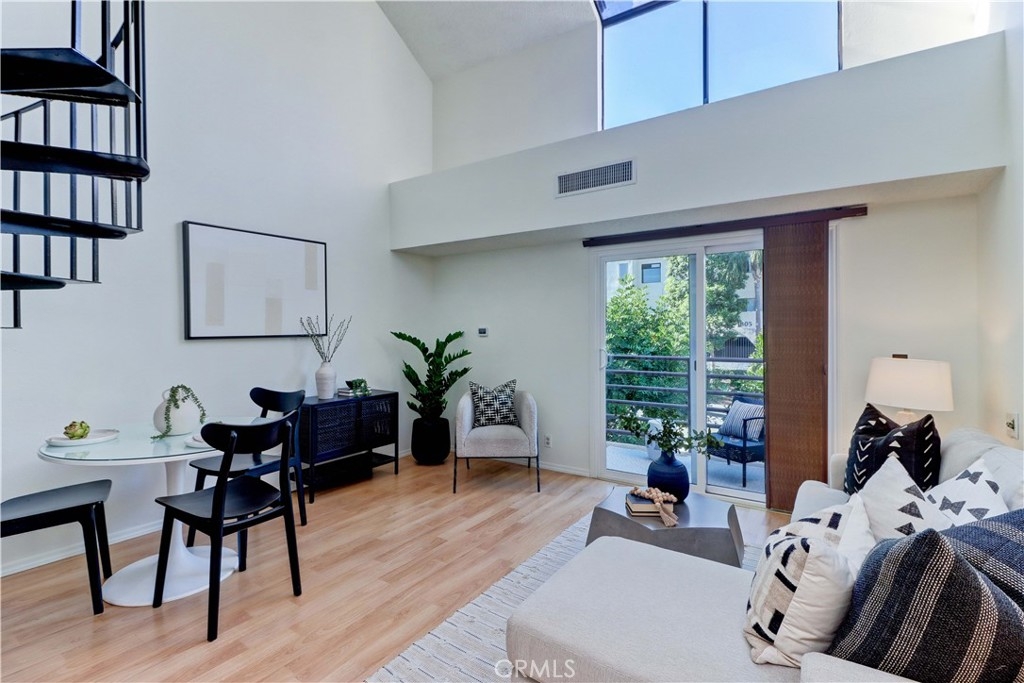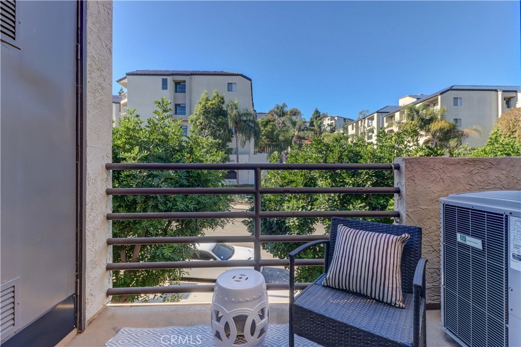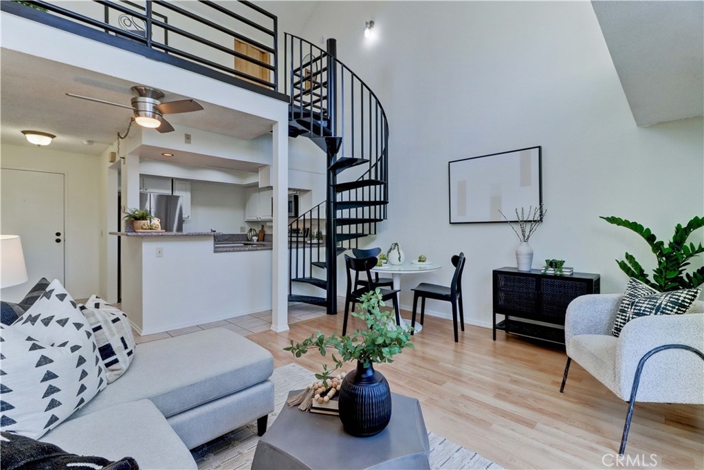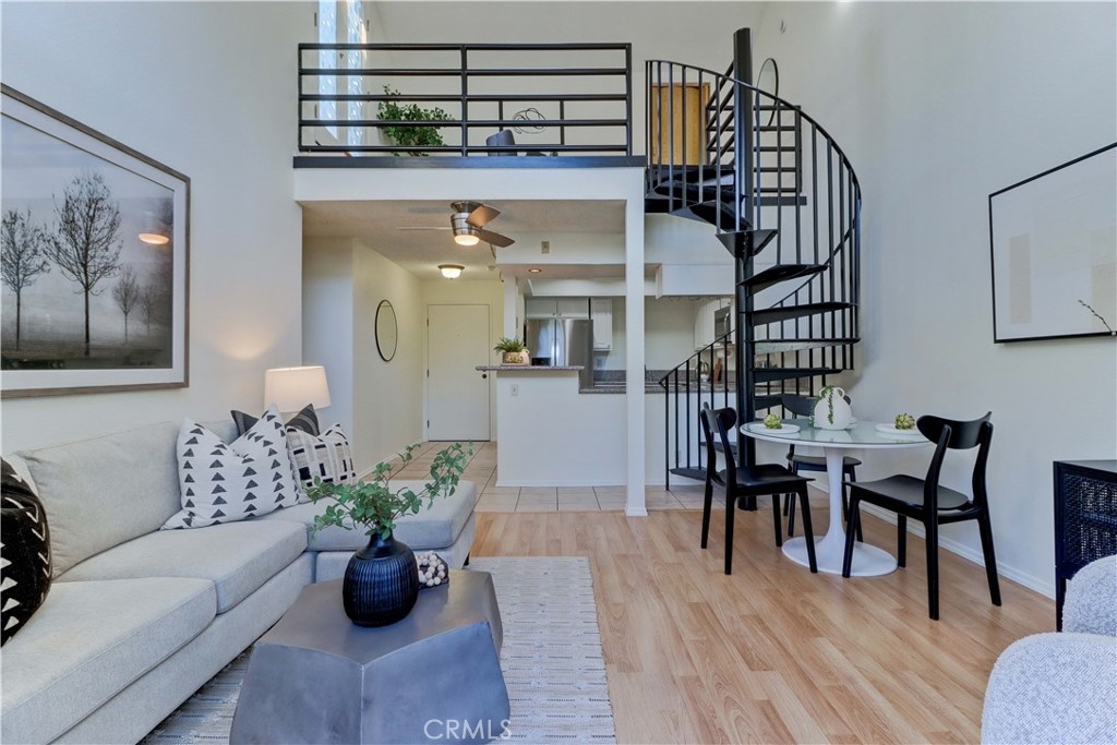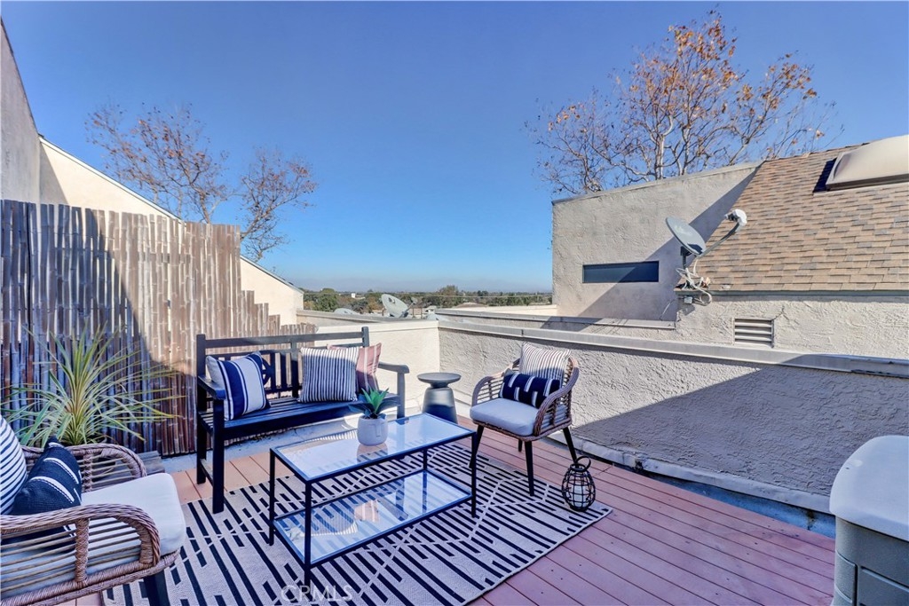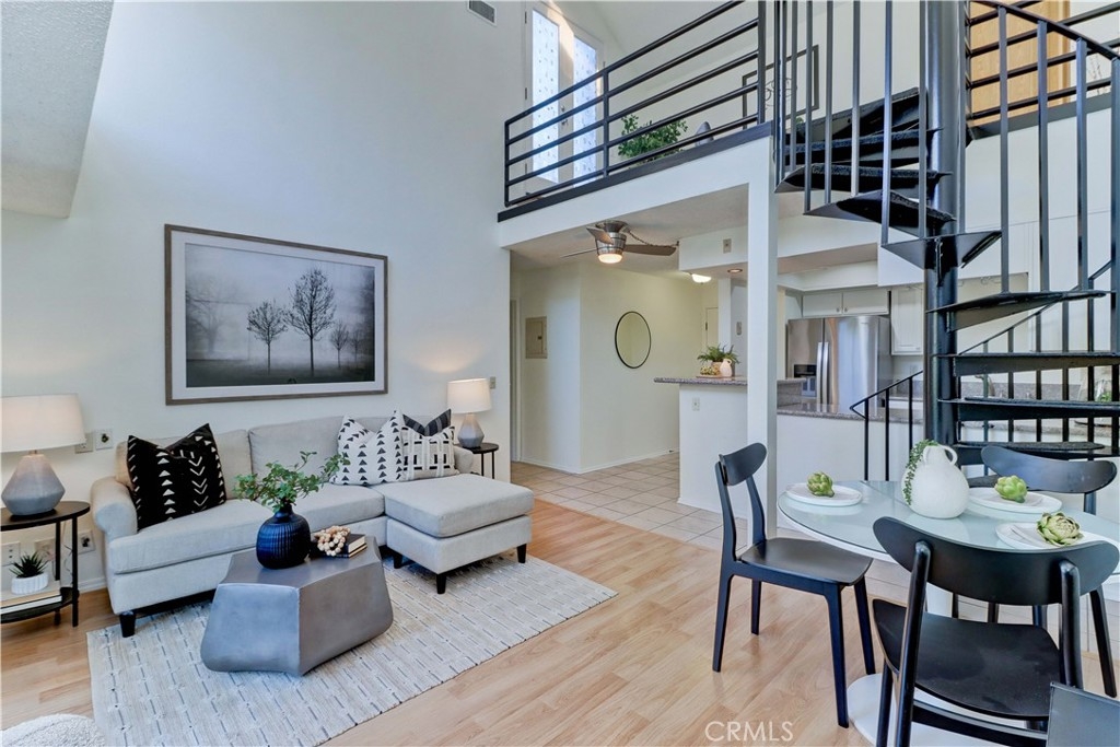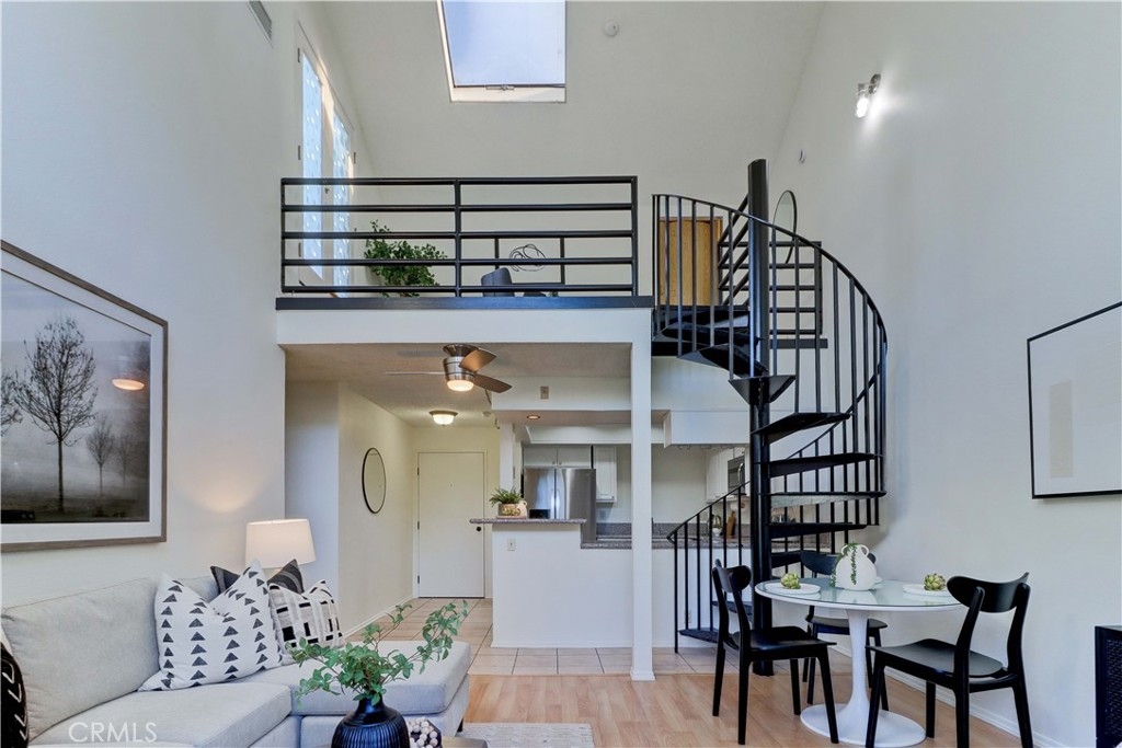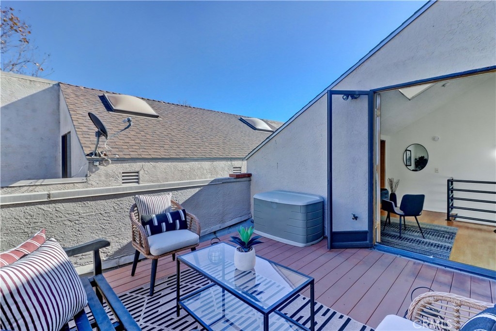 Experience refined living in this stunning one-bedroom condo with a loft and rooftop deck. The open floor plan exudes sophistication with cathedral ceilings, striking second-story windows, and a stylish spiral staircase. Sunlit living spaces feature sleek laminate flooring, while the private balcony offers a serene retreat for alfresco dining and relaxation. The kitchen impresses with white cabinetry and pull-out shelves, granite counters, a breakfast bar, lazy Susan, recessed lighting, and stainless appliances, including a brand-new LG electric range. The spacious primary suite boasts double doors, a vaulted ceiling, laminate flooring, and a walk-in closet with custom organizers. The bathroom features a shower-tub combination and an updated vanity with ample counter space. The loft, with vaulted ceilings, laminate flooring, and a skylight, is perfect as a home office or guest bedroom. French doors open to a private rooftop deck with panoramic mountain and city light views (rare in community). A hidden storage room with shelves and folding door adds practicality. Additional features include a stackable laundry closet, upgraded dual-pane windows and slider, custom blinds, upgraded central air and heat, and an assigned parking space conveniently located near the elevator. Villa Pacifica, a gated community with a pool, spa, assigned storage lockers, and pet-friendly amenities, offers water, trash, and sewer included in the monthly HOA dues. Two pets approx 25lbs. and under are welcome. Enjoy proximity to freeways, dining, shopping, beaches, and popular coffee houses. This exceptional home combines elegance, convenience, and charm. Hurry!