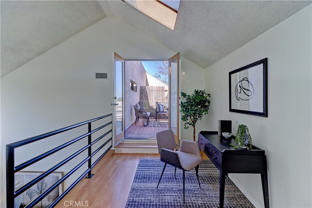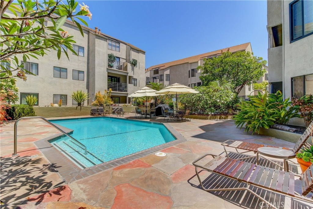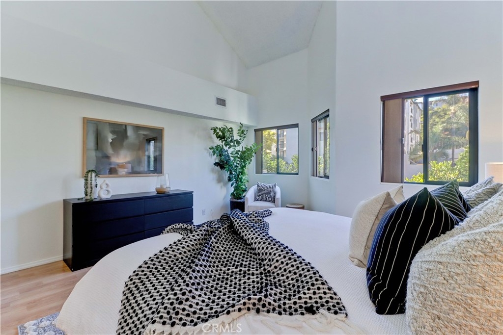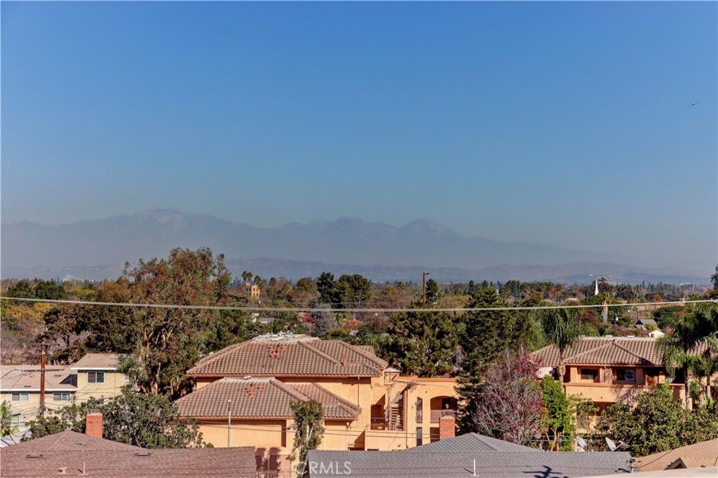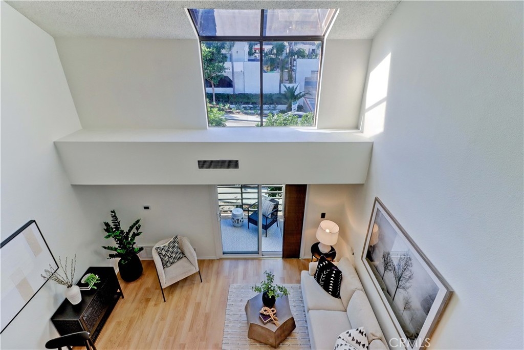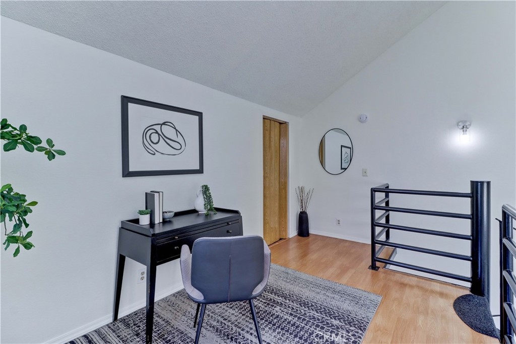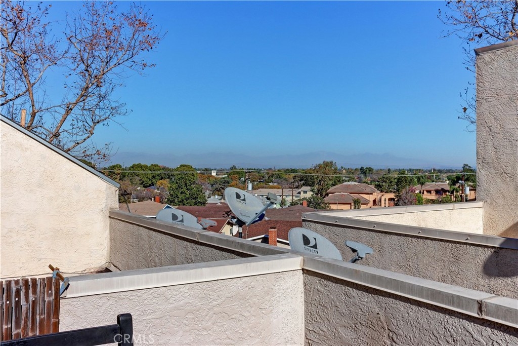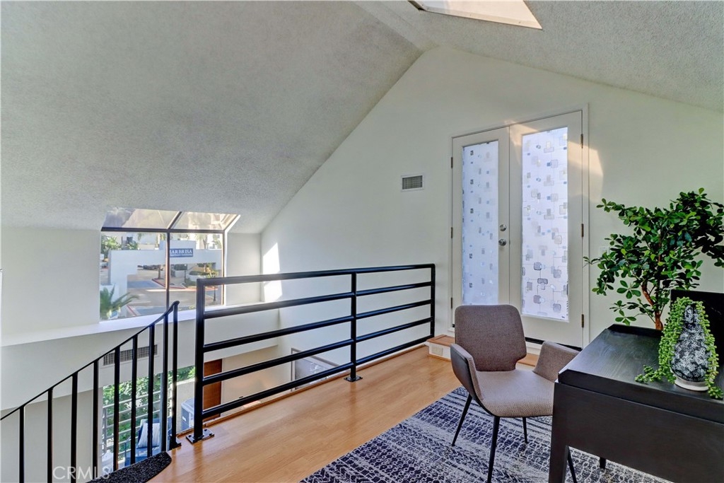 Experience refined living in this stunning one-bedroom condo with a loft and rooftop deck. The open floor plan exudes sophistication with cathedral ceilings, striking second-story windows, and a stylish spiral staircase. Sunlit living spaces feature sleek laminate flooring, while the private balcony offers a serene retreat for alfresco dining and relaxation. The kitchen impresses with white cabinetry and pull-out shelves, granite counters, a breakfast bar, lazy Susan, recessed lighting, and stainless appliances, including a brand-new LG electric range. The spacious primary suite boasts double doors, a vaulted ceiling, laminate flooring, and a walk-in closet with custom organizers. The bathroom features a shower-tub combination and an updated vanity with ample counter space. The loft, with vaulted ceilings, laminate flooring, and a skylight, is perfect as a home office or guest bedroom. French doors open to a private rooftop deck with panoramic mountain and city light views (rare in community). A hidden storage room with shelves and folding door adds practicality. Additional features include a stackable laundry closet, upgraded dual-pane windows and slider, custom blinds, upgraded central air and heat, and an assigned parking space conveniently located near the elevator. Villa Pacifica, a gated community with a pool, spa, assigned storage lockers, and pet-friendly amenities, offers water, trash, and sewer included in the monthly HOA dues. Two pets approx 25lbs. and under are welcome. Enjoy proximity to freeways, dining, shopping, beaches, and popular coffee houses. This exceptional home combines elegance, convenience, and charm. Hurry!