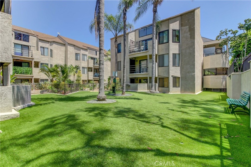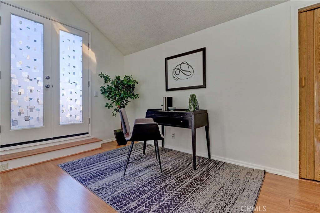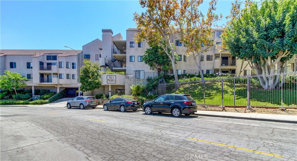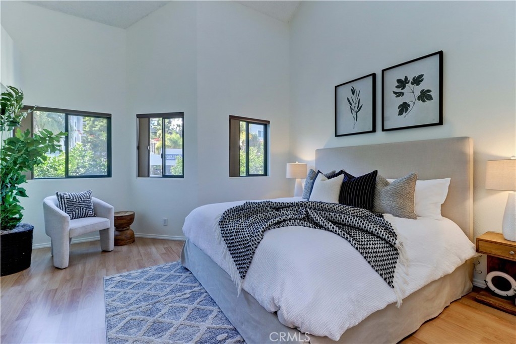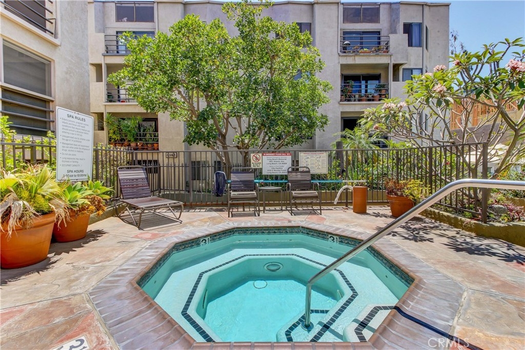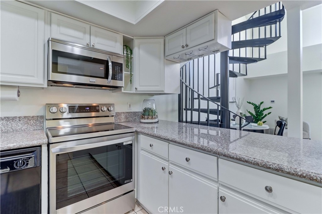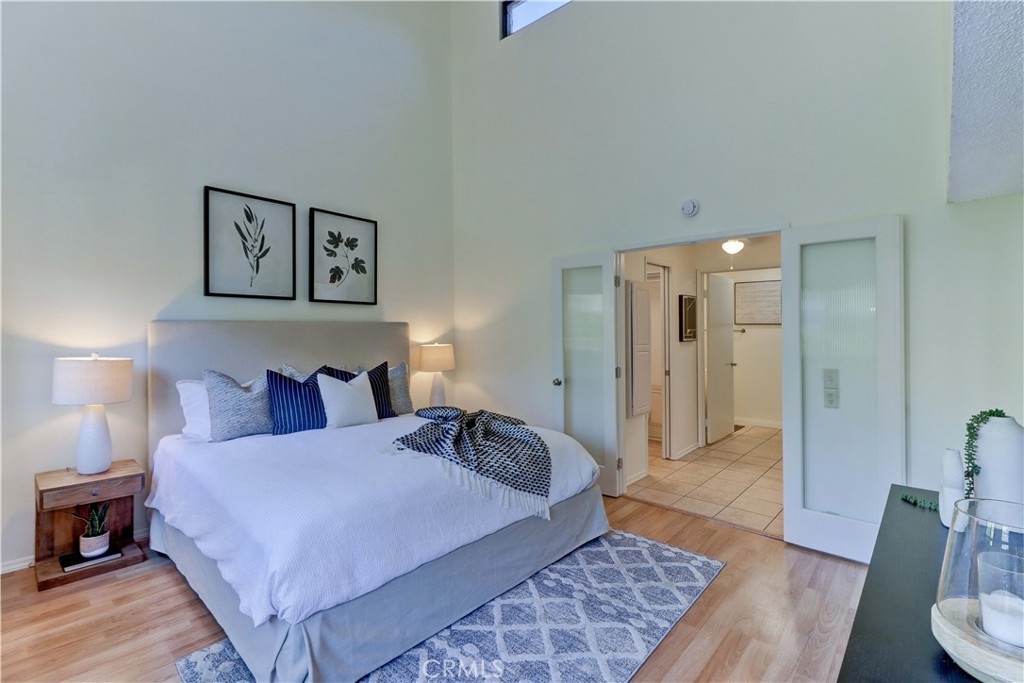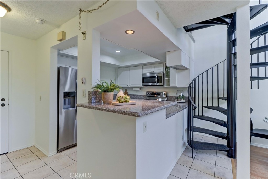 Experience refined living in this stunning one-bedroom condo with a loft and rooftop deck. The open floor plan exudes sophistication with cathedral ceilings, striking second-story windows, and a stylish spiral staircase. Sunlit living spaces feature sleek laminate flooring, while the private balcony offers a serene retreat for alfresco dining and relaxation. The kitchen impresses with white cabinetry and pull-out shelves, granite counters, a breakfast bar, lazy Susan, recessed lighting, and stainless appliances, including a brand-new LG electric range. The spacious primary suite boasts double doors, a vaulted ceiling, laminate flooring, and a walk-in closet with custom organizers. The bathroom features a shower-tub combination and an updated vanity with ample counter space. The loft, with vaulted ceilings, laminate flooring, and a skylight, is perfect as a home office or guest bedroom. French doors open to a private rooftop deck with panoramic mountain and city light views (rare in community). A hidden storage room with shelves and folding door adds practicality. Additional features include a stackable laundry closet, upgraded dual-pane windows and slider, custom blinds, upgraded central air and heat, and an assigned parking space conveniently located near the elevator. Villa Pacifica, a gated community with a pool, spa, assigned storage lockers, and pet-friendly amenities, offers water, trash, and sewer included in the monthly HOA dues. Two pets approx 25lbs. and under are welcome. Enjoy proximity to freeways, dining, shopping, beaches, and popular coffee houses. This exceptional home combines elegance, convenience, and charm. Hurry!