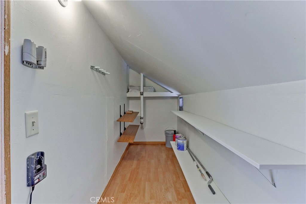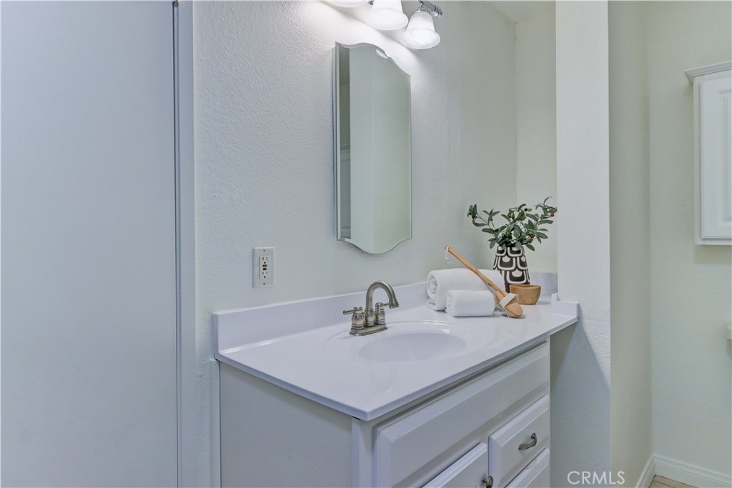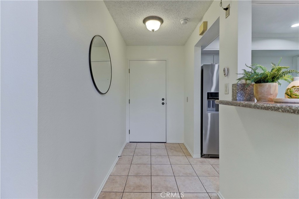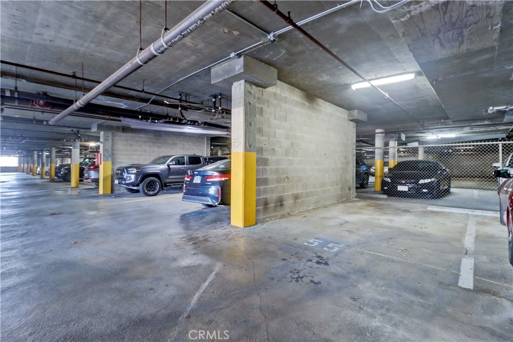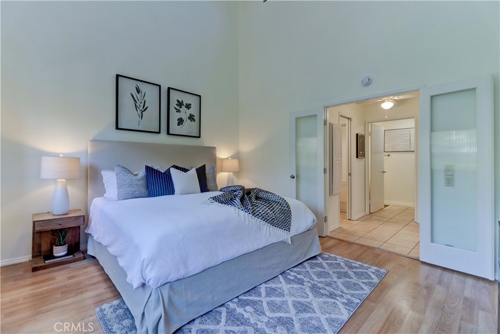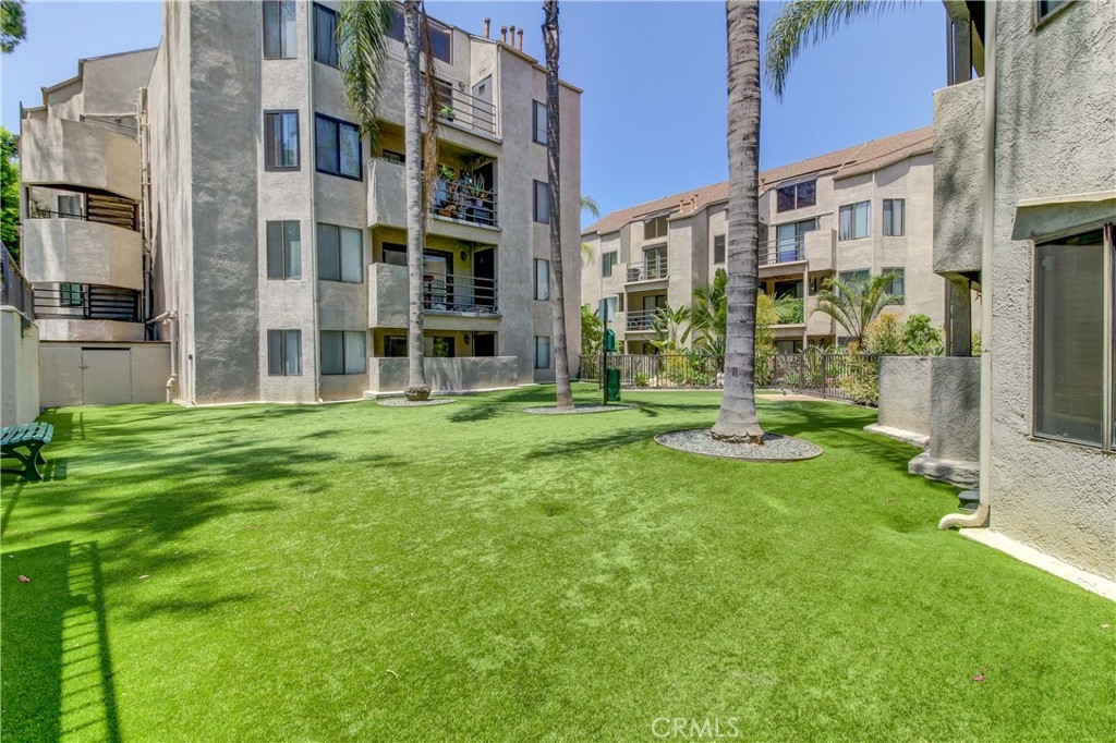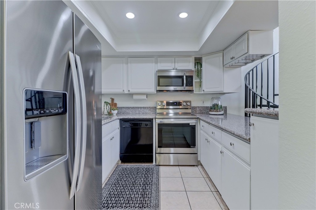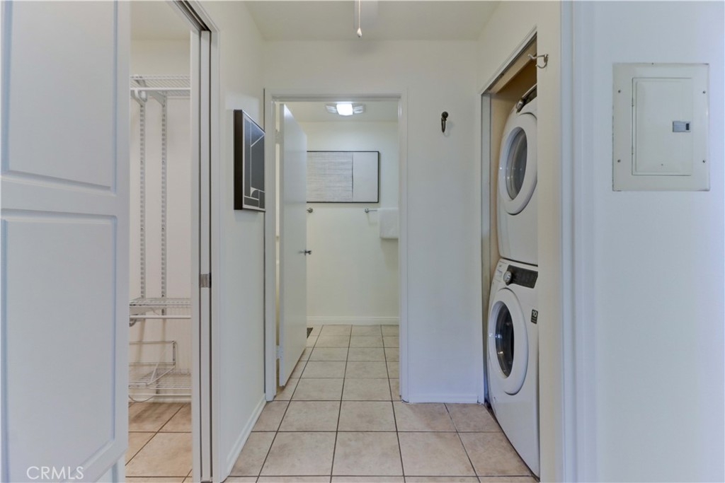 Experience refined living in this stunning one-bedroom condo with a loft and rooftop deck. The open floor plan exudes sophistication with cathedral ceilings, striking second-story windows, and a stylish spiral staircase. Sunlit living spaces feature sleek laminate flooring, while the private balcony offers a serene retreat for alfresco dining and relaxation. The kitchen impresses with white cabinetry and pull-out shelves, granite counters, a breakfast bar, lazy Susan, recessed lighting, and stainless appliances, including a brand-new LG electric range. The spacious primary suite boasts double doors, a vaulted ceiling, laminate flooring, and a walk-in closet with custom organizers. The bathroom features a shower-tub combination and an updated vanity with ample counter space. The loft, with vaulted ceilings, laminate flooring, and a skylight, is perfect as a home office or guest bedroom. French doors open to a private rooftop deck with panoramic mountain and city light views (rare in community). A hidden storage room with shelves and folding door adds practicality. Additional features include a stackable laundry closet, upgraded dual-pane windows and slider, custom blinds, upgraded central air and heat, and an assigned parking space conveniently located near the elevator. Villa Pacifica, a gated community with a pool, spa, assigned storage lockers, and pet-friendly amenities, offers water, trash, and sewer included in the monthly HOA dues. Two pets approx 25lbs. and under are welcome. Enjoy proximity to freeways, dining, shopping, beaches, and popular coffee houses. This exceptional home combines elegance, convenience, and charm. Hurry!