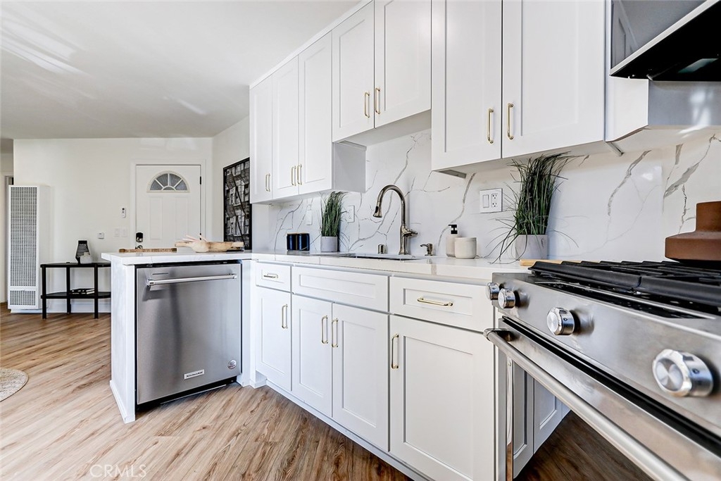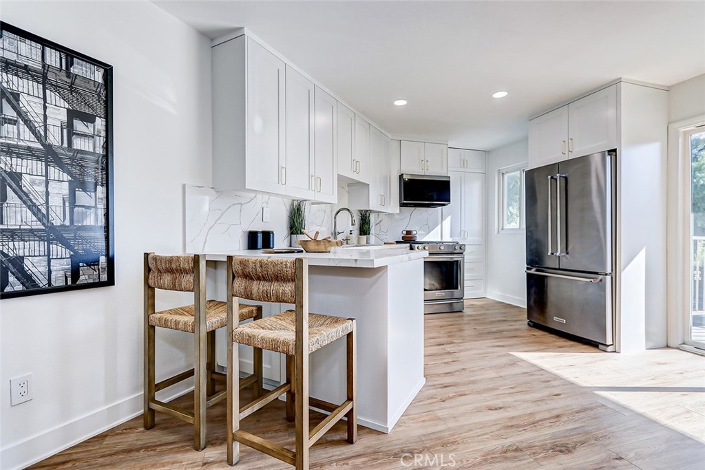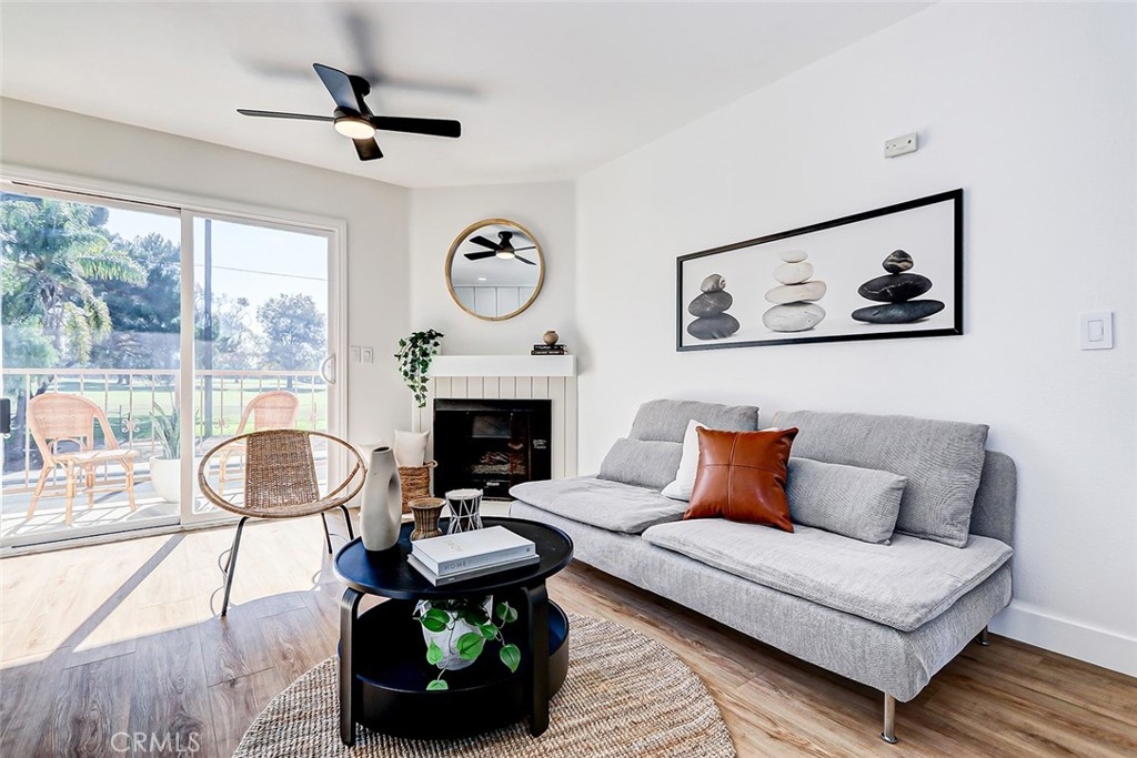 Stunningly Renovated 2-Bedroom, 1-Bath Condominium with Breathtaking Golf Course Views Step, where style and comfort seamlessly blend. The open floor plan is accentuated by brand-new engineered hardwood floors that flow throughout the main living areas, while the bedrooms are cozy with fresh, plush carpeting. The kitchen is a true showstopper, featuring sleek white cabinetry, top-of-the-line stainless steel appliances, and stunning quartz countertops—perfect for both cooking and entertaining. The spacious living room invites relaxation, with a charming fireplace creating a warm, inviting atmosphere. Step through the sliding doors to your private balcony and take in the serene, lush views of the golf course—an ideal spot for al fresco dining or simply unwinding in peace. The bathroom has been tastefully updated, offering a newly tiled shower, and polished nickel fixtures. Additional upgrades include recessed lighting, stylish new ceiling fans in every room, and fresh, neutral paint throughout, creating a bright and airy environment. For ultimate convenience, an in-unit laundry nook provides a tucked-away space for your laundry needs, and two assigned underground parking spaces are included, offering added security and ease. Located in a prime area with easy access to shopping, dining, the beach, entertainment, top-rated schools, and major freeways, this condo is truly a dream come true. Move-in ready and waiting for you—come see it today!