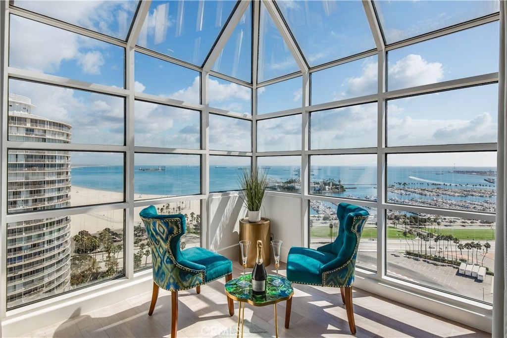 The famed designer Penthouse for those seeking the extraordinary. Views, north, south, east & west through 12ft(est) greenhouse windows of the Ocean, Coastline, Newport Beach, Palos Verdes, Harbor, Marina, Los Angeles, City & the San Gabrial Mountains. This custom designed/built top floor corner penthouse with 4 balcony's designed by Internationally acclaimed Australian abstract artist Sallie Swift with her innovative abstract signature style in each room from eco-conscious bamboo flooring, acrylic paneling, drop down T.V., fireplace & more. Luxury modernism at it's best w/300-degree views, open floor plan of living, dining, that could host 50 guests. This private corner home has 2685sf, 3 beds/ baths, living, dining, study and 4 balconies. The flawlessly designed gourmet Chef's kitchen of Fisher & Paykel & more, 1 beverage refrigerators, induction cooktop, 2 wine refrigerator, dishwasher, commercial size refrigerator/freezer, walk-in pantry, & wine cellar. You are spell-bound with a new definition of resort ocean living that embrace the exhilaration of New York City. There are two primary suites and in the ocean suite you are captivated by the sunset/dawn as you wake up to ocean views from your bed through glamorous greenhouse windows situated in your private ensuite bedroom sitting area. A two doored walk-in 2 walk in closet make this ensuite perfection The Ensuite bathroom featuring tub, separate shower with dual sinks and vanity are done with the exquisite artistry and masterfulness of Swift. The Second primary bedroom ensuite as luxurious as the first with 12 (est.) greenhouse windows & sitting area that spans the gorgeous views of Los Angeles with a stunning ensuite bathroom. The third bedroom with custom built-ins & closets galore, built-in Murphy bed could also function as an art room. A beautifully designed study with enormous built-ins could also be used as a secluded media/television, tech room or overnight guest room. Separate laundry closet with custom storage shelves includes a stackable washer/dryer. Amenities include 24/7 security, payable laundry/ dry cleaning service, lockers for packages, gym, sauna, community office, rentable room for parties, on site general manager, heated pool, jacuzzi, Bike storage room & garage cabinet, 2 parking spaces, Information deemed reliable but not guaranteed. Buyer has responsibility of Broker/brokers agents do not represent or guarantee accuracy of info, buyer responsible/verification.