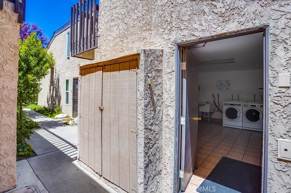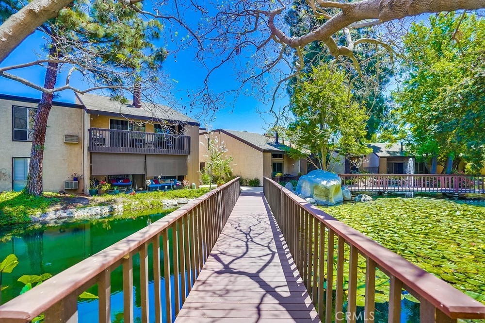 Come see this special and tranquil place. Remodeled and spacious 1 bedroom condo with large private patio entry, ceramic tile flooring throughout, beautiful kitchen with custom cabinetry, Corian counter tops, newer stainless steel appliances, newer fridge is included, vaulted ceilings and light & bright living room with view of atrium patio. Spacious bedroom with sliders out to patio area, full bath and large closet. Large storage closet on patio. Walking paths with bridges and streams throughout common areas, fantastic amenities such as 2 pools, spas, saunas, workout room and billiard room. Newer Bosch washer and dryer in unit and included. One carport parking spot included.